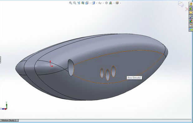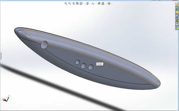 Usted puede seleccionar dos o tres veces, hasta conseguir una forma y tamaño está satisfecho con. Ahora que tienes el perfil básico de los peces diseñados, borrar la línea de centro y se saca hacia afuera a un grosor razonable. Ajusté mis entre 10 y 15 milímetros, hasta que me dieron una forma y perfil que parecía proporcional. Luego utilice la herramienta de filete con un radio de 2-3 milímetros, para crear la forma de peces redondos. Luego entra en modo de bosquejo una vez más y dibujar los círculos a los lados, superior e inferior donde se quiera sacar los agujeros para fijar el gancho, línea y cualquier peso o atraer componentes como hilanderos a.