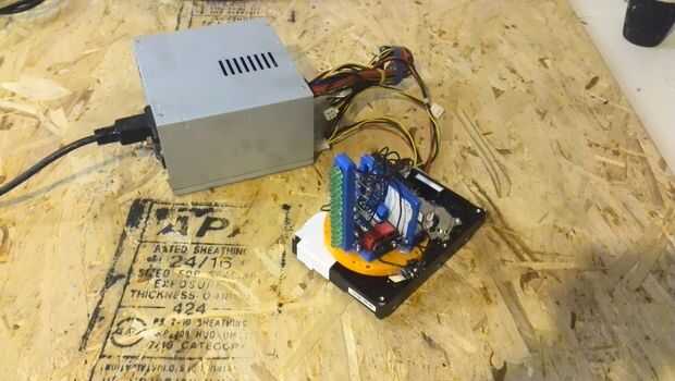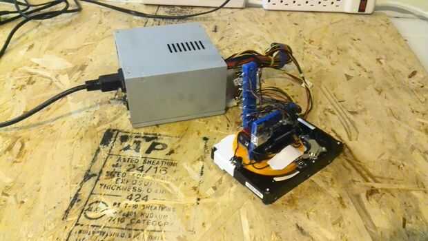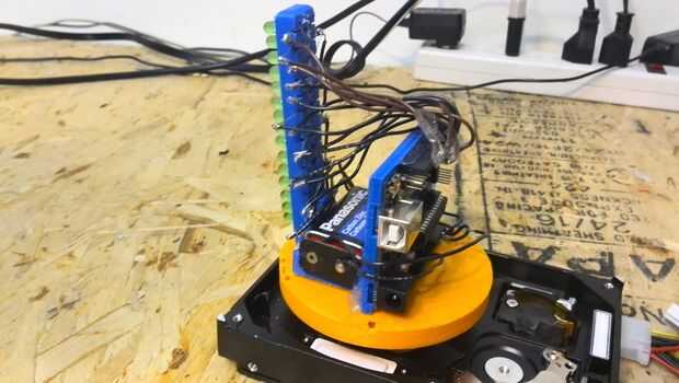 El motor HDD es alimentado por una fuente de alimentación. Un pedazo de cinta blanca se une a la esquina del disco duro. Montado en el motor, son un conjunto de LEDs, un arduino, 9v y un sensor de color. El sensor de color es paralelo a la pieza de cinta blanca. Todos estos artículos son girar muy rápido por el motor del disco duro. Cuando, las libraciones de sensor de color sobre el blanco de la cinta, el arduino parpadea la hora actual, columna por columna.