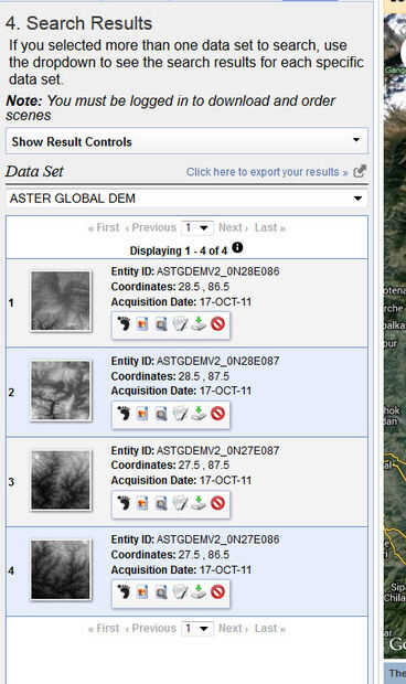 Se le presentará con una lista de los archivos para descargar. Observe que los datos en bloques de terreno uno de grado de latitud y un grado de longitud, a cada lado. Si la zona invade en cualquier región de un grado, el archivo de esa región se mostrará en la lista de resultados.