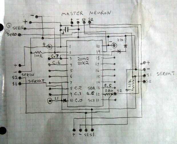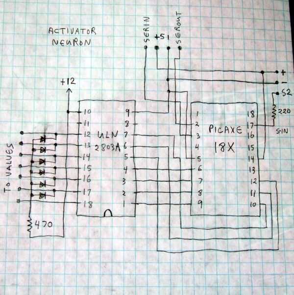 Aquí es el esquema para la la neurona robot master que controla las válvulas neumáticas que potencia los músculos artificiales. Básicamente hay tres Picaxe microcontroladores que en serie están conectados en red. Una neurona principal envía comandos a las dos neuronas de actuador que las válvulas de control.