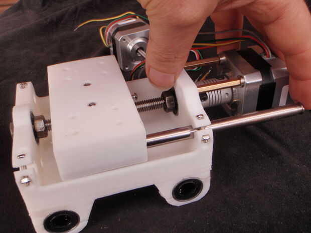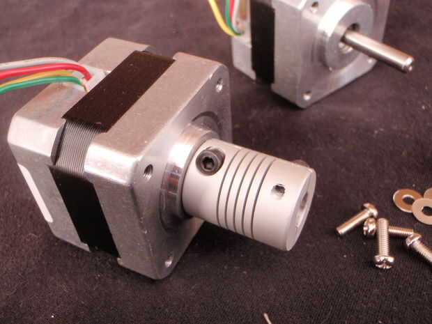 Los motores paso a paso son NEMA estilo motor y necesitan tener 4 cables (bipolares) y un eje de 5mm. El distancia entre agujeros de montaje es de 31mm y tienen un paso de 1,8 grados. Son bastante comunes por lo que no deberías tener ningún problema encontrando. Como se puede ver en las fotos el eje era un poco demasiado largo así que los corte para mejor ajuste del acoplamiento. La diapositiva de la herramienta fue cabida aquí para mejor claridad de foto, puede ser más fácil para adaptarse a la diapositiva de la herramienta después de después de la diapositiva de z se incorpora a la máquina.