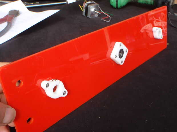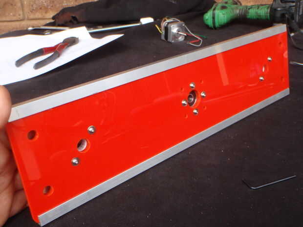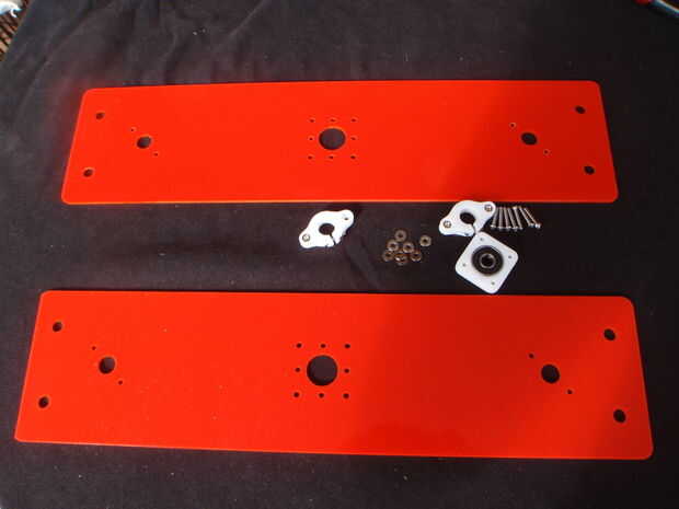 Las placas delanteras y traseras son idénticos y 2 hojas de acrílico de 3mm en cada plato como es todo el cortador del laser a que tengo acceso es capaz de cortar. Podría hacer las placas de cualquier material adecuado, o simplemente cortar en lugar de 6 mm. Si no tienes acceso a un cortador láser podría imprimir el DXF a tamaño completo, use una plantilla y cortar y perforar las placas, lateral y placa superior utilizando herramientas de mano.