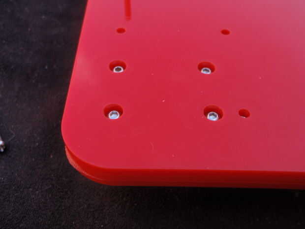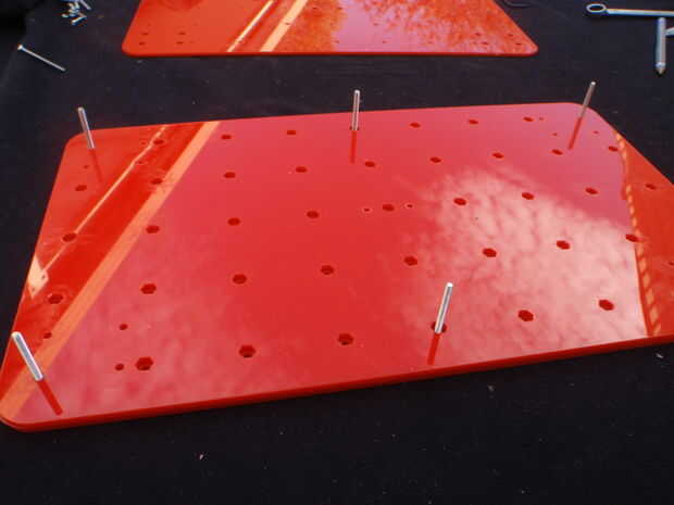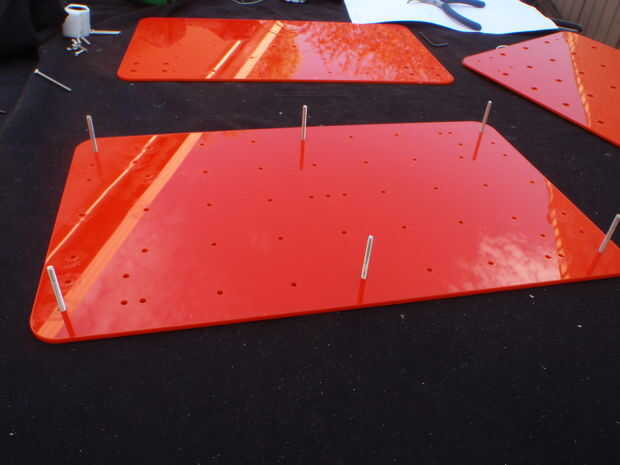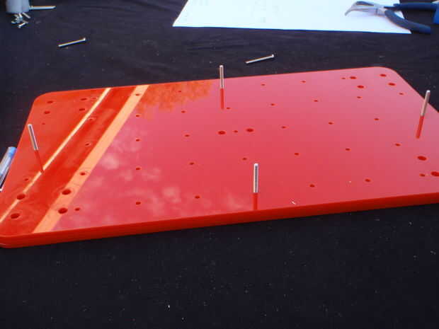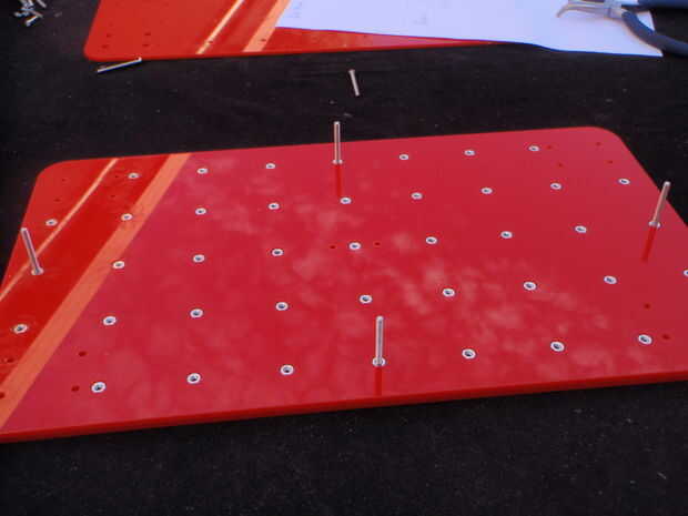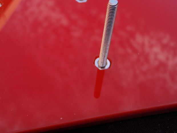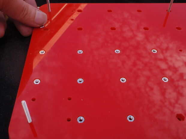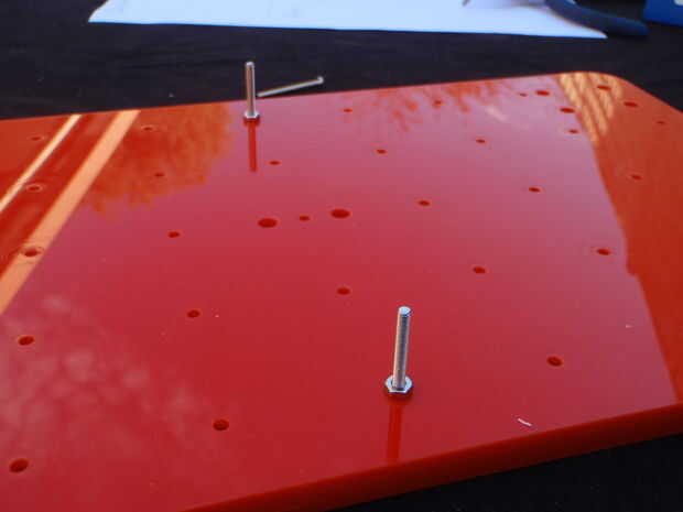 - Ajuste X4or 6 pernos de 30mm a través de la sábana bajera con los hilos hacia arriba en el centro de cada lado. (Estos tornillos alinearán las tres placas y se eliminará más tarde)