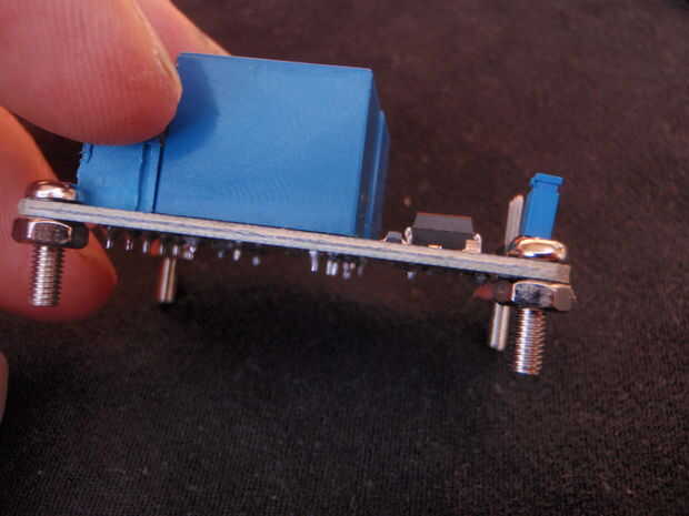 - El relé también puede ser atornillado con pernos de 16 mm de M3, utilice 4 tuercas en la parte inferior del relé como espacios para dar espacio a la parte posterior de la placa de circuito