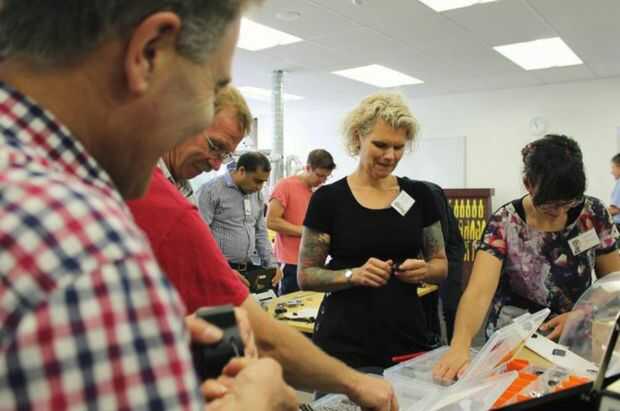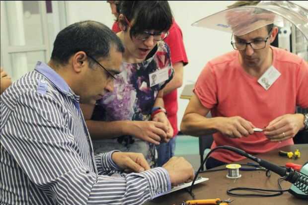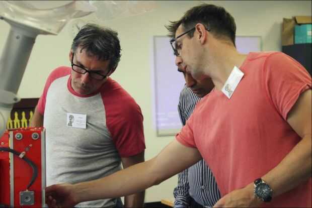 Cada uno tenía un ir en la eliminación de la balsa de piezas impresas y montaje rodamientos, tuercas motores, revisar el instructivo y las otras dos máquinas, y al final creo que mucha gente sentía que podría construir uno. Uno de los participantes lucharon con la diapositiva de la herramienta no alineados, en el momento que no estaba segura de lo que había salido mal, después la máquina casera que descubrí que había insertado un par de tuercas en la posición equivocada, por lo que ahora se observa en el Paso8 de este instructable. Así se corrigió y ahora se desliza perfectamente.