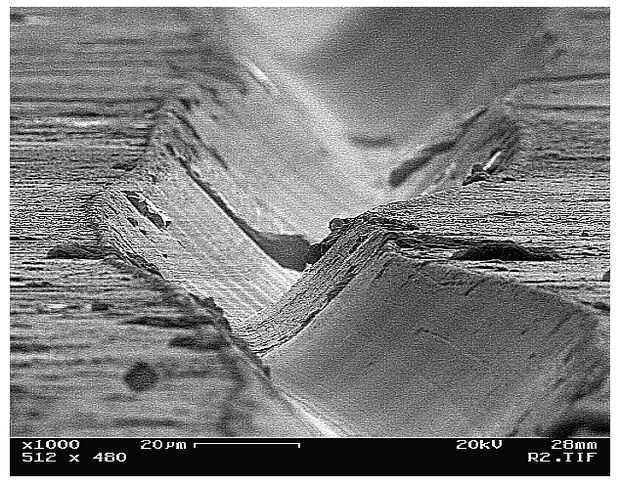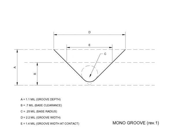 Fig 4 fue hecha por branku62 en el vinylengine.com, muestra las dimensiones del perfil de un surco mono microgrove estándar, que esto es lo que usted encontraría en un moderno mono de 33 o 45 (estéreo ranuras se cortan realmente un poco más pequeñas). En la mil de diagrama 1 = 1/1000", que trata de 25um. Microsurco records requieren un lápiz con una punta de radio mil de 0,7 a 1,0, la punta hace contacto con la ranura en el E en la figura 1, un ancho de aproximadamente 1.4 mil. La profundidad de la ranura es aproximadamente 1.1 mil. Estas dimensiones coinciden muy bien con las dimensiones de las imágenes de microscopio electrónico.