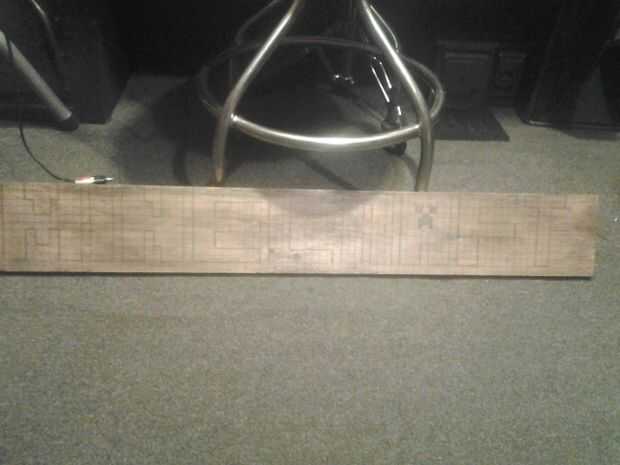 Ahora que hemos creado una red en el repintado de la madera la imagen del logo en la red como en su papel de gráfico. Lo hice por oscurecimiento ligeramente detrás de las líneas de frontera de las letras, de esa manera que las líneas seguía siendo claro/definido para poder ver fácilmente más tarde cuando comencé a recortar el espacio de huecos/negativo del diseño.
