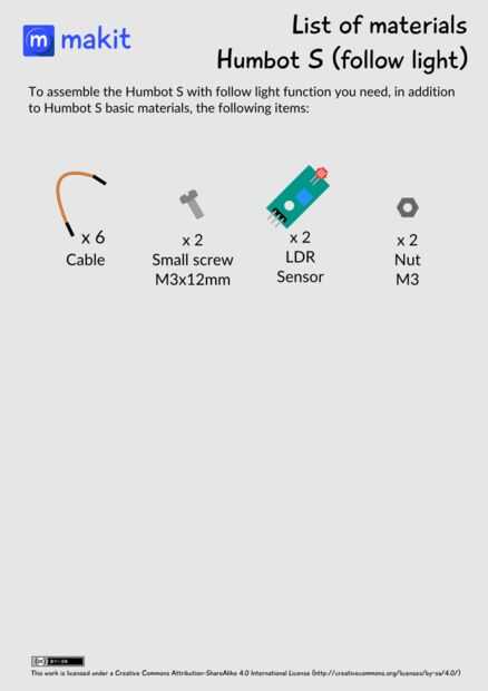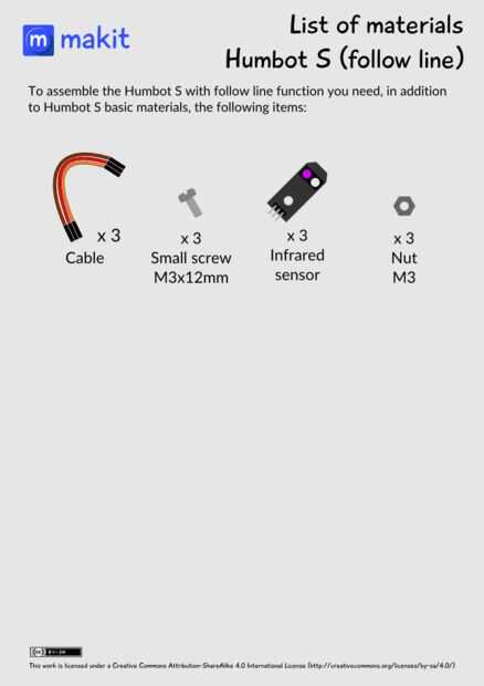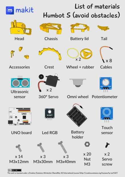 - Opcional: touch sensor, led RGB, potenciómetro, módulo y cables extras, bluetooth HC-05. Esto pueden utilizarse para añadir funcionalidades extras a tu Humbot.