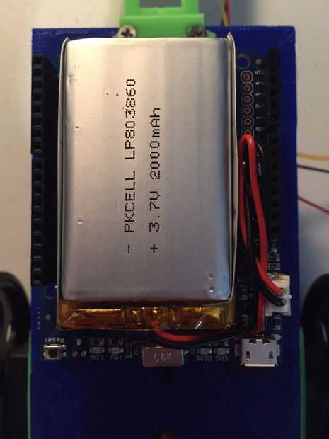 Este robot tiene un chasis 3D impreso. Tiene un arduino uno de los cerebros, servos de rotación continua para el movimiento, una batería AA para alimentar los servos, una batería de iones de litio y circuito de carga/boost (bajo la forma de un escudo) para alimentación del arduino, un escudo PWM para controlar los servos y por último, los sensores!