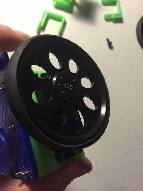 Seguir adelante y coloque los neumáticos de goma en las ruedas. Entonces, uso los pequeños tornillos Phillips negro que deben tener vinieron con los servos para fijar las ruedas a los servos.