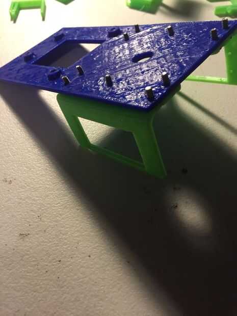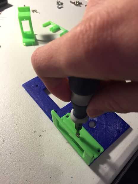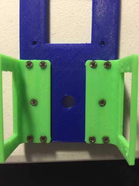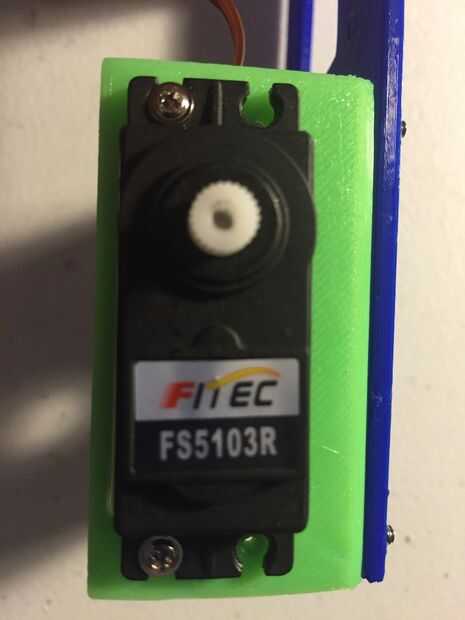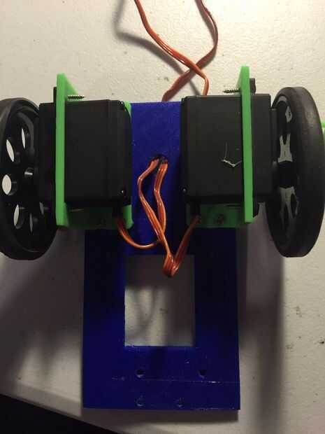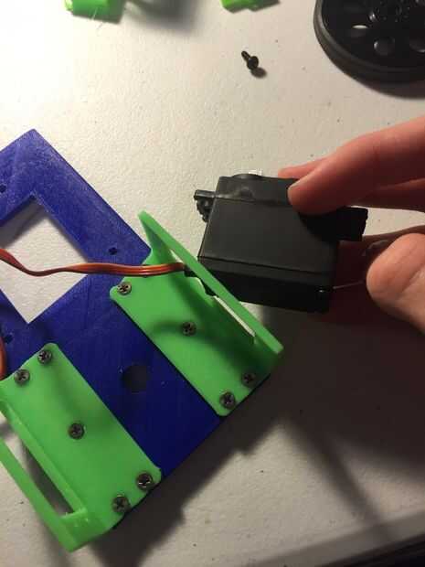 Ahora puede atornillar los soportes del Servo (que usted debe tener impresas anteriormente) a la placa principal del robot utilizando 10 #4-40 (5 tornillos para cada soporte). Asegúrese de que la abertura quede hacia fuera, y que los soportes se colocan en el fondo y no la parte superior. A continuación, pasar los cables de los servos a través de los recortes y deslice el servo en asegurarse de que los cables queden hacia la parte delantera del robot. Luego, atornillar los servos en el uso de los tornillos largos plateado que deberían haber sido incluidos con sus servos.