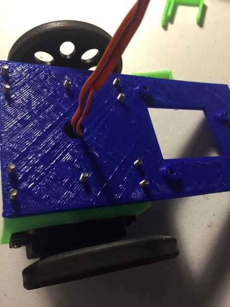 Por último, deslice los cables del servo a través del agujero en la placa principal por lo que pueden llegar a la electrónica en la parte delantera. Puede ser útil poner un trozo de cinta en cada cable que indica si va el servo izquierdo o derecho.