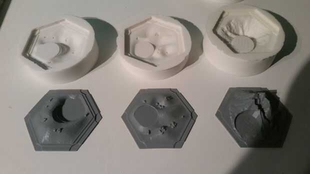 Desde allí he utilizado un producto llamado molde 30 Max. Es un producto de molde semi firme silicona. Fácil de usar. Me puse mis impresiones 3D en un corto marco para sujetar la silicona líquida mientras se secaba. Esto es donde ser delgada era buena. Quería las bases gruesas así que cuidadosamente había construido las impresiones 3d con una arcilla firme. Asegurándose de que eran todos de altura uniforme. Esto no sólo ahorrar un poco de coste en la impresión pero también creó un sello hermético alrededor de la base silicona tan poco filtrado bajo la impresión.