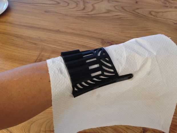 PLA se endurece gradualmente en el transcurso de un minuto después se ha eliminado de su fuente de calor, por lo que tendrá una ventana razonable en el que forma el guante. Y el guante se puede re-formado en cualquier momento repitiendo los pasos de la calefacción. Preparar el brazo colgando un trozo de tela sobre el área que es colocarse el guante. Rápidamente quitar el guante de la fuente de calor y cuelgue el brazo y aplique presión para formar el guante en el brazo. Compruebe que el orificio del pasador son paralelo y en un lugar cómodo. Puede continuar mantener el guante en posición hasta que el PLA firmas para arriba, o puede sostener el brazo y guantelete en su lugar en el lavadero y deje correr agua fría sobre ambos para establecer la forma del guantelete.