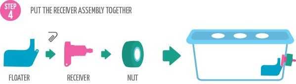 Coloque el flotador en el receptor usando un pequeño alambre doblado a los lados para mantener las dos piezas juntas (un clip hará el truco). Trabajando desde la parte interior del envase plástico, deslice el eje del receptor por el agujero lateral y fíjela al contenedor usando la tuerca. El cuerpo del flotador debe colgar cerca de la parte inferior del envase.