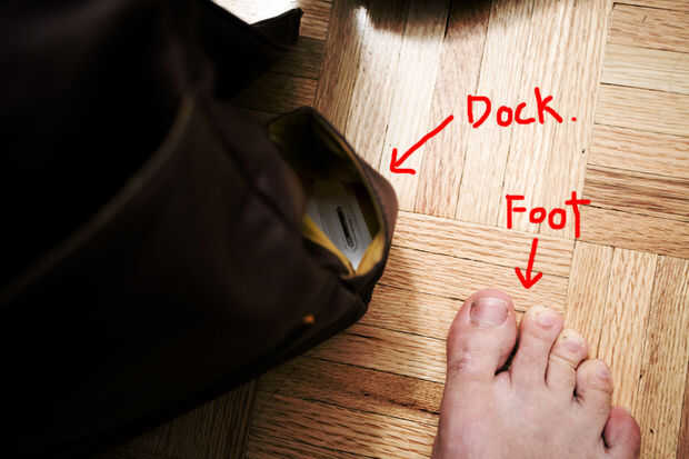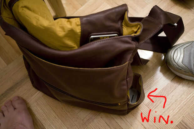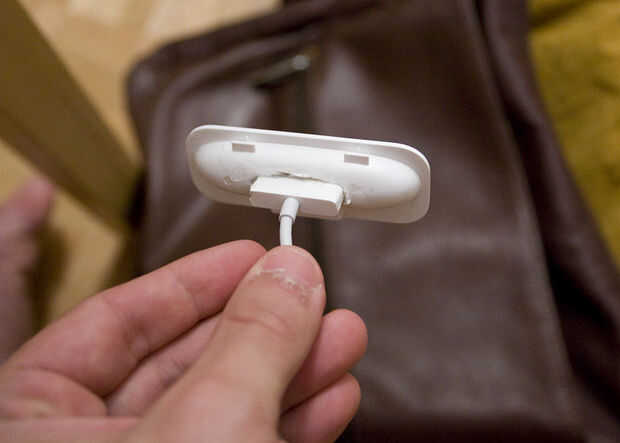 Así, construir un muelle en mi bolso y por cable a través de un bolsillo interior donde hay una batería portátil. Ahora, cuando me deslizo mi iPhone en el bolsillo, se consigue cargar!!!!
