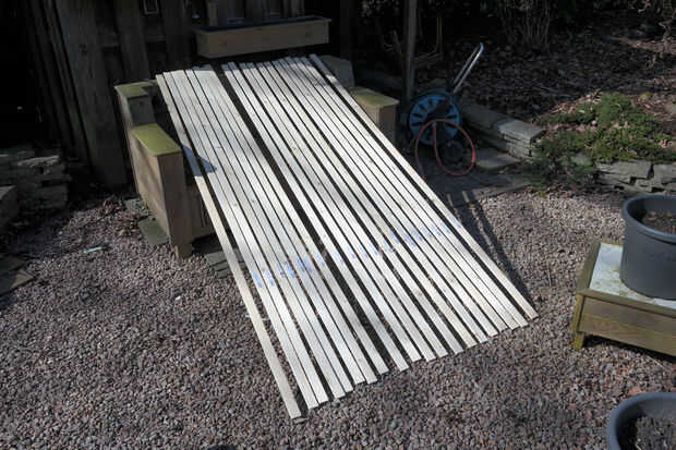 Último paso es montar los listones sobre todos los bordes (horizontales o verticales no). Contar el número de aristas (tanto largos, cortos y el espaciador) que son bastante empinadas para no recoger el agua y cortar los listones a la misma longitud que los puntales. Pintar los bordes después de cortar, así que la madera se sella completamente. Luego, utilizando una pistola de clavos, martillo y clavos o tornillos, montar los listones a los puntales.