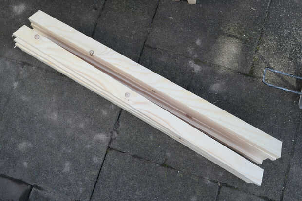 Lo primero es cortar la madera de la capa inferior a la medida. El ángulo de corte debe ser 18 grados a cada lado (10 elementos, 36 grados por elemento, 2 lados), pero la longitud depende del tamaño de la cúpula que están construyendo. En mi caso, los elementos son 900mm medidos desde el interior. Pueda ser sensato a pruebe la colocación de los elementos antes de pintar.