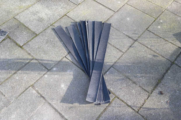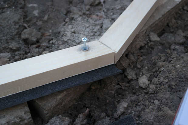 Una barrera de humedad debe ser montado entre el hormigón y la madera. Hormigón absorbe el agua, y si ninguna barrera se colocó, la madera se pudre lejos. Utilicé material de cubierta de betún, porque teníamos un pedazo de hacer un cobertizo, pero debería funcionar cualquier material resistente y estanco. Corte en largo 900mm, tiras de 100mm de ancho, 10 en total.