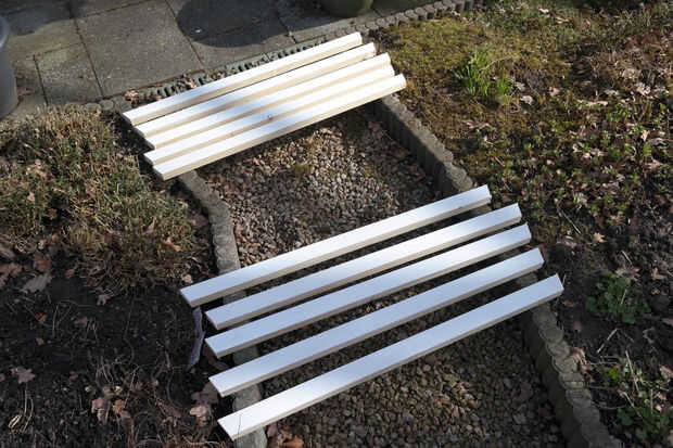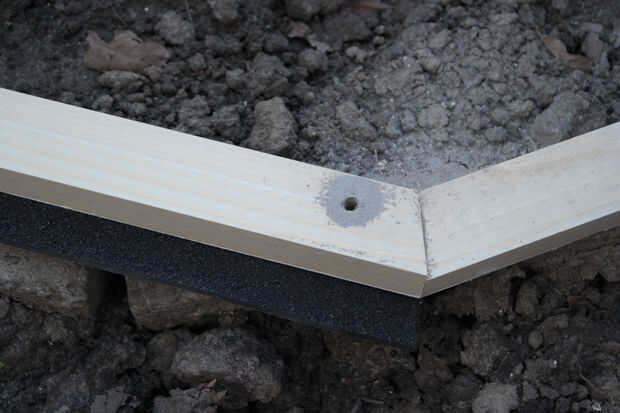 Cuando la pintura esté seca, es hora de montar los elementos. Con mi configuración, tuve 2 traslapos por elemento en concreto. Use un taladro percutor para perforar el tamaño que tus tacos requieren. Coloque la capa de barrera de humedad en el hormigón donde desea que el elemento, coloque el elemento madera en la parte superior y empezar a taladrar un agujero en el sándwich. Los agujeros deben estar en el centro de las baldosas de concreto, otra cosa que el azulejo se agrietará. Cuando el agujero es bastante profundo, inserte un pasador y utilice un martillo para fijarla.