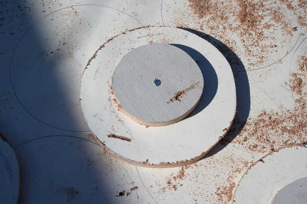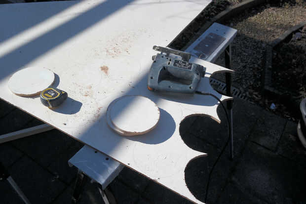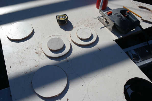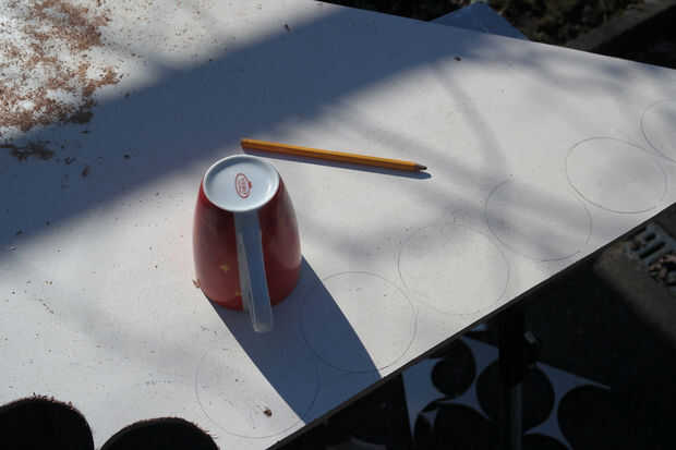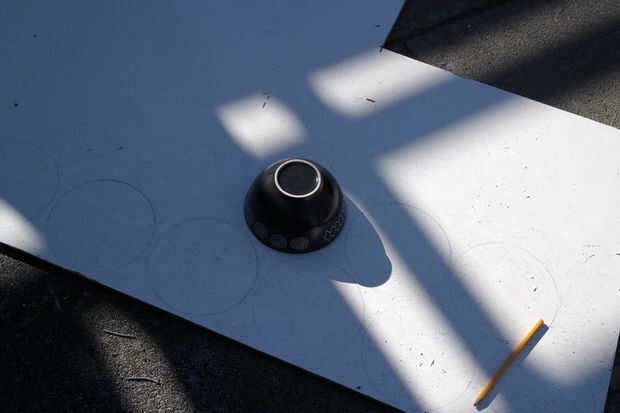 Para hacer los conectores de la esquina, encontré un tazón y una taza que me dio un diámetro más o menos correcto. Utilizando un lápiz para trazar los bordes de los discos. Entonces, usando una sierra de calar, cortar los discos. Finalmente, utilice un pequeño tornillo para conectar el disco pequeño al disco grande, aproximadamente en el centro. Para hacer esta cúpula, se necesitan 25 conectores. (Nota de lado, una cúpula de 2V realmente necesita 26 conectores, pero no se usa el conector en la entrada).