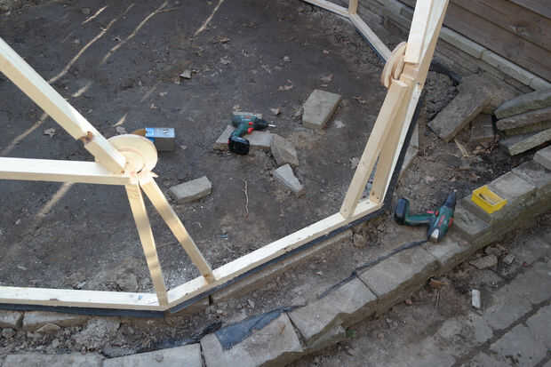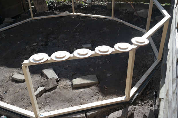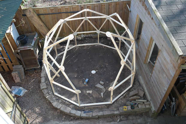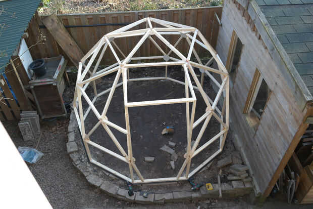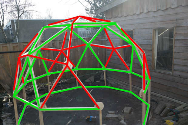 Tengo un esquema del patrón y un cuadro modificado mostrando cómo se relaciona esto con el invernadero real. Ahora viene la belleza, si sigues este patrón, la cúpula básicamente se construye. No te preocupes milímetros, no importa. No tienes que medir al edificio, solo globo ocular para asegurarse de que todos puntales algo están alineados.