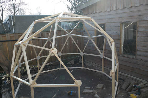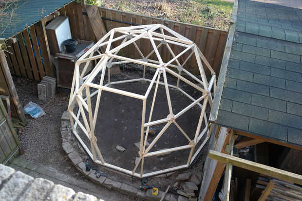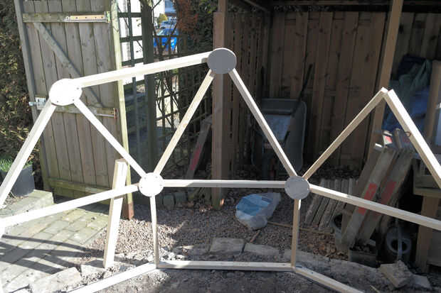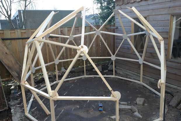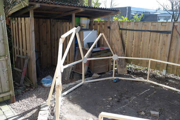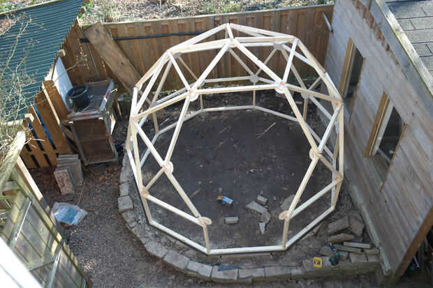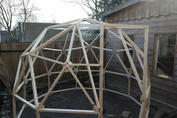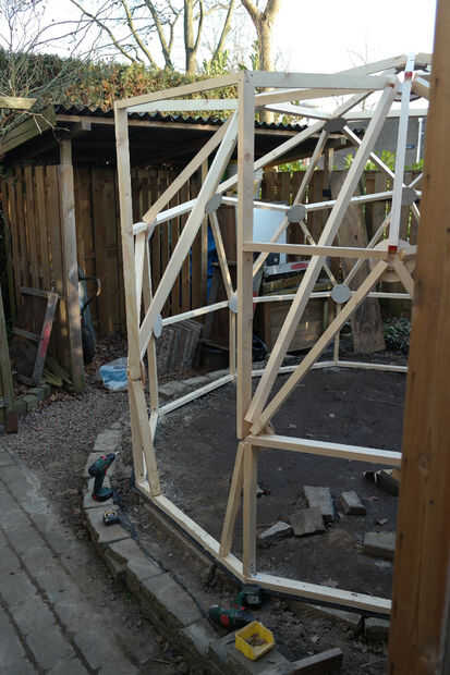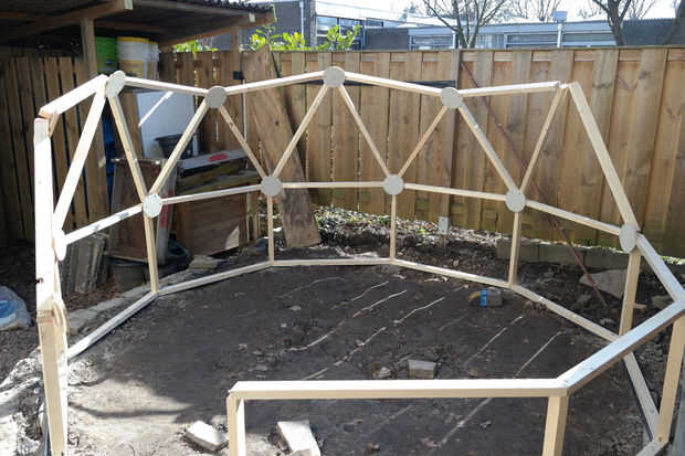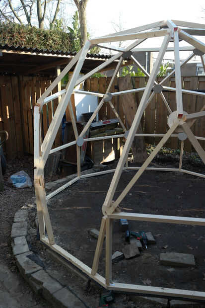 Sea cual sea, intenta hacer triángulos. Esto es lo que da a la cúpula de su fuerza. Alrededor de la puerta refuerzo adicional fue agregado para compensar la debilidad causada por la puerta. Entonces un marco fue construido que llevará a cabo la puerta.