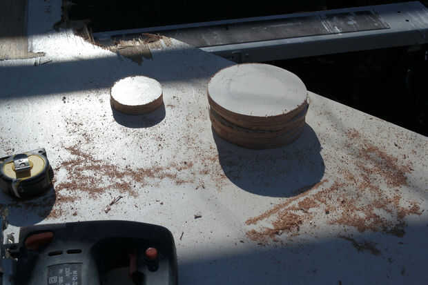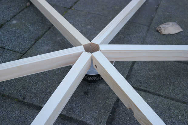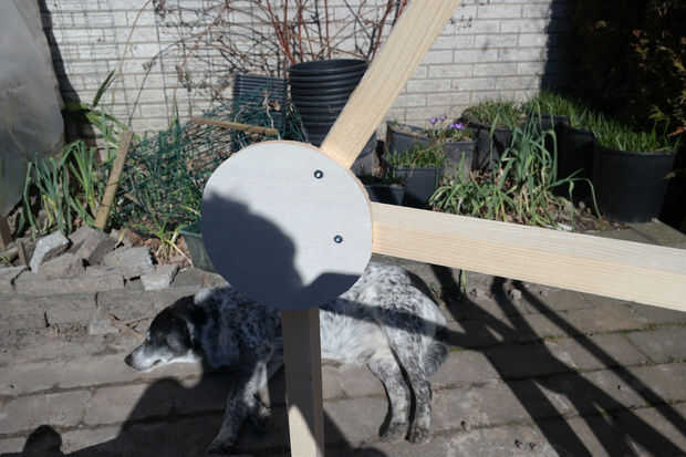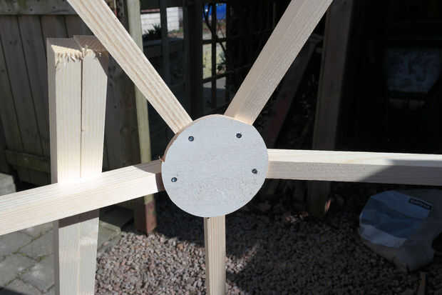 La parte más importante de un domo geodésico es el conectador de la esquina. He intentado encontrar algo tan simple como sea posible para hacer un conector de esquina buena. Terminé con 2 discos de madera contrachapada (1cm de espesor), 1 de 15cm y 1 de 8cm. Cuando se apilan, estos discos dan un ángulo de 17 grados, perfecto para una cúpula de 2V. Los puntales se conectará con los tornillos de la parte posterior, 2 por lado por el puntal.