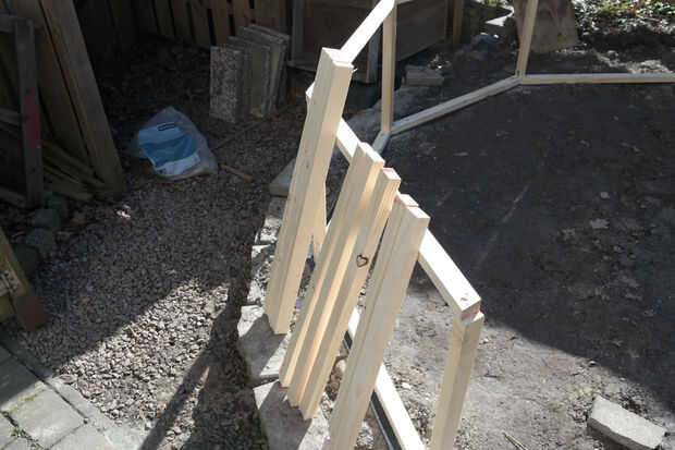 Los puntales están a continuación. Tienen que cortar a la longitud. Los 2 anillos son realmente las costillas largas y 900mm. Esta será la referencia para los puntales. son necesarios 2 tipos: el tipo corto (tipo A) y el tipo largo (tipo B). Con una longitud del puntal B de 900mm, las costillas de A deban ser 796mm de largo. Esta longitud es de centro a centro. El conector tiene un adicional de 20mm de cada lado de la costilla. Para compensar esto, el puntal A cortarse a 756mm y el puntal B 860 mm de largo. Tendrá 28 A struts y struts 21 B. (esto es con los elementos de la puerta a la izquierda hacia fuera).