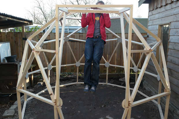 En este punto la cúpula está en la resistencia final. Si te sientes seguro de tu trabajo, puede probar la fuerza de la cúpula. Tengo 75kg, y mi cuerpo apenas movido cuando cuelgo de él. Lo curioso es que todos puntales sólo celebran con 1 tornillo, no 2. Se trata de qué tan fuerte son estos domos.