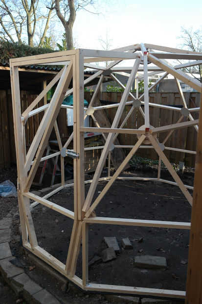 Primero empezar por hacer un marco cuadrado de la puerta que encaja perfectamente en la cúpula. Montaje de la cúpula con bisagras y comprobar holguras. Cuando esté satisfecho con su separación de la puerta, mida y haga un puntal diagonal en el marco de la puerta. Entonces, hacer un marco para llenar la parte inferior de la puerta. Por último, Monte el pestillo en el marco de la puerta y prueba.