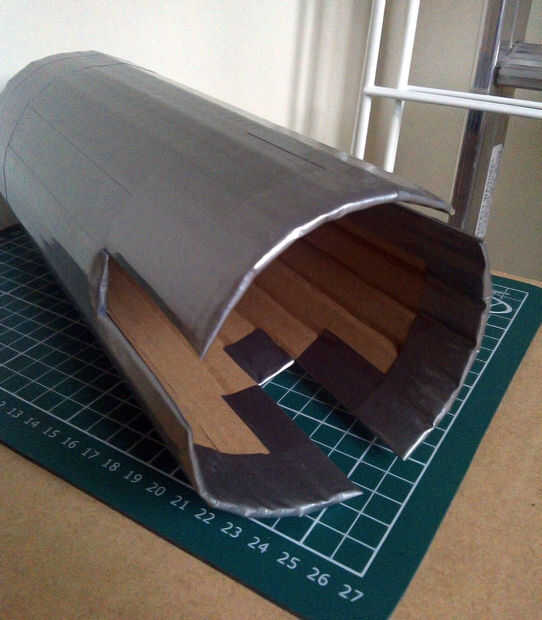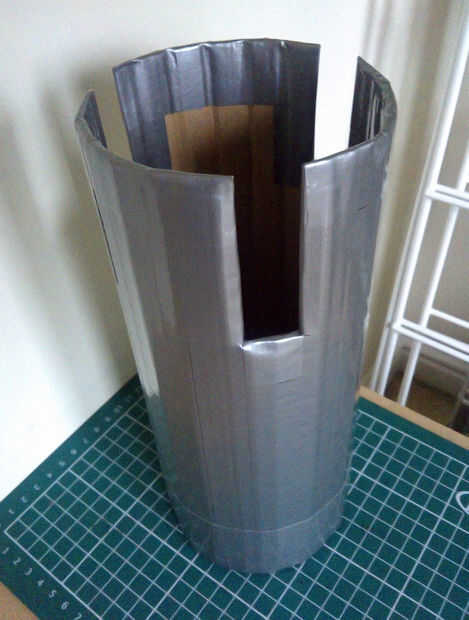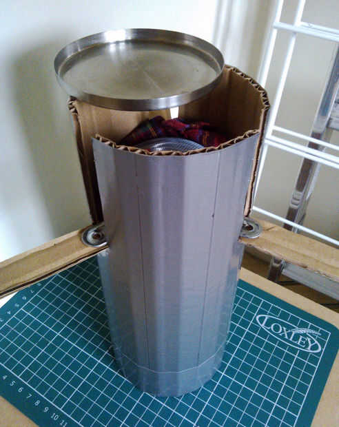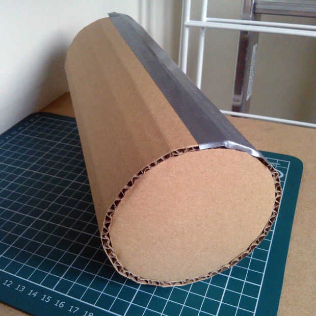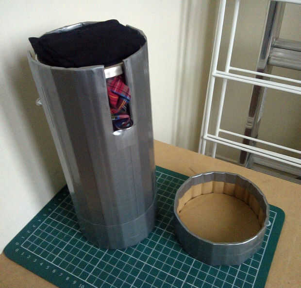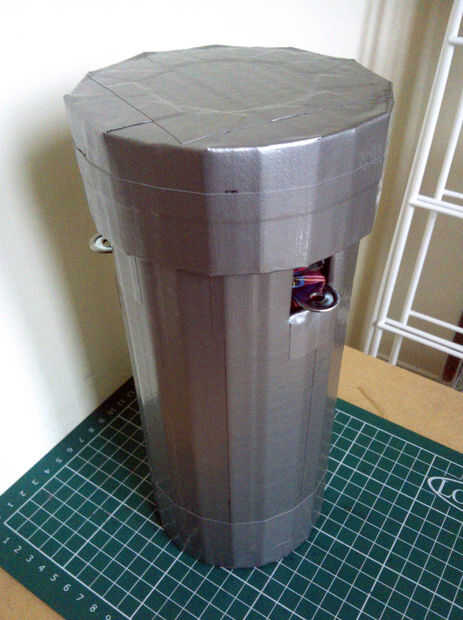 Cuenta con caso personalizado hecho de cartón y cinta adhesiva.