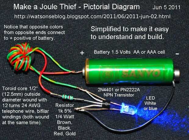 En el circuito Joule Thief, el LED se ha sustituido por un diodo y el condensador de 10 uF suaviza las ondas de tensión que se producen. Desde 2.4V es demasiado alto para el Joule Thief operar, debe utilizarse un diodo para soltar el exceso de tensión. Para voltajes más altos de la batería, utilice diodos más o un retroceso parcial. También he incluido un diagrama que muestra cómo al viento el grano del toroide. Deben trabajar tres turnos. El circuito Joule Thief y estroboscópico dibuja cerca de 45 mA en modo de espera.