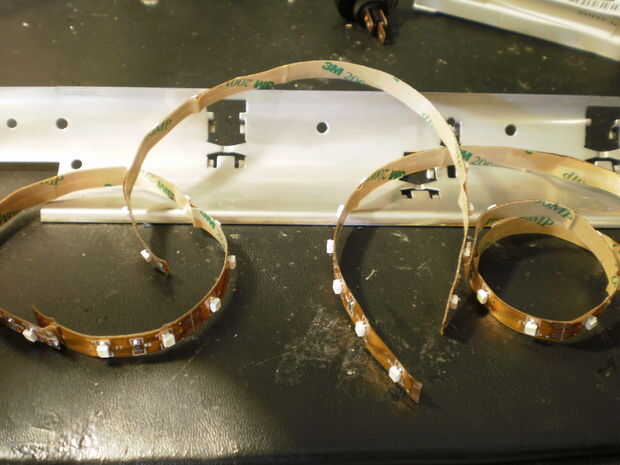 Una vez terminada la prueba, desconecte las puntas de la tira LED. No utilice calor prolongado porque la tira está hecha de plástico. A continuación, corte la tira de un metro en cuatro tiras iguales. Hay puntos de separación cada dos pulgadas que tienen lengüetas de cobre de la soldadura. La polaridad está marcada en cada punto de la separación, por lo que no se preocupe de realizar un seguimiento de. Después del corte, las lengüetas de la soldadura de la lata. Si no está familiarizado con lo que estañar es, significa aplicar una pequeña cantidad de soldadura a la superficie. Retire ahora la curva de cada tira doblando para que cada uno en posición plana y coloque las tiras de lado a lado. Cortar algunas piezas cortas de cable, tira de sus extremos y les lata. Utilice estos pedazos de alambre de soldar las tiras de LED detrás juntos como se ve en la última foto. Porque todo es estañado, soldadura extra no debería ser necesario. Asegúrese de que coincidan con la polaridad como se indica en las tiras.
