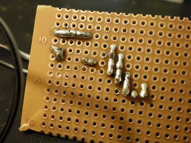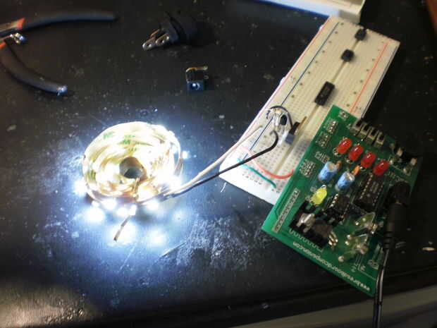 Estos LEDs son baratos, y queremos que dure mucho tiempo. Por lo tanto se implementa un circuito para protegerlas. El circuito sí es sentido común (bueno, de todos modos los ingenieros eléctricos) y fácil de entender. R2 es una resistencia de ajuste actual. Cuando el exceso de corriente pasa por Q2, R2 vuelve a dirigir la corriente para activar Q1, que luego se convierte a Q2. Para esta particular secuencia de LEDs, valor de R2 debe ser 1,25 ohms a 1/2 watt. Por desgracia, no hay ninguna resistencia en ese valor. Para acercarse, se colocan dos resistencias de 2,2 ohm en paralelo para obtener 1,1 ohms. Lo suficientemente cerca. Para más detalles sobre estos tipos de circuitos de control de LED y cómo calcularlos, consulte este Instructable. Dan proporciona una explicación detallada sobre su diseño y aplicación, así como algunas excelentes ideas para otros circuitos.