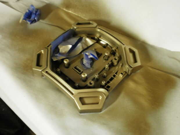 Ahora usted puede comenzar a decorar la base. Si su base no es ya de color latón, seguir adelante y pintura también. Asegúrese de no pintar las zonas donde va a aplicar el vinilo y en los puntos donde obstaculizaría adhesivos utilizados para el montaje de piezas. Grabado en off el polo solía montar el post y la zona donde se montaría la placa de circuito.