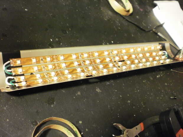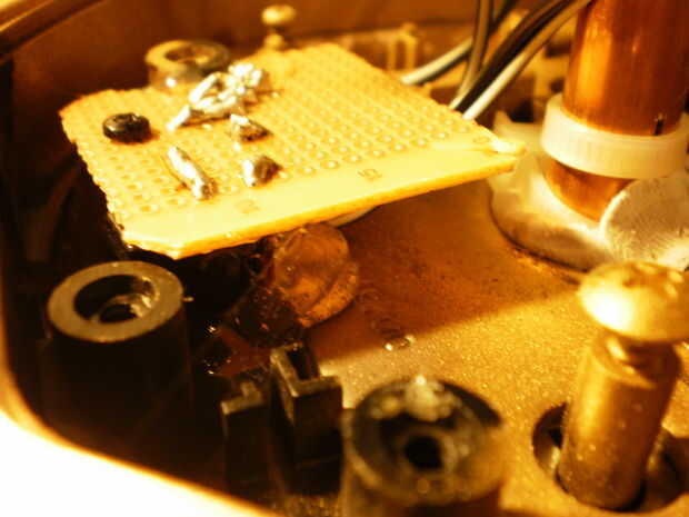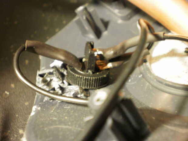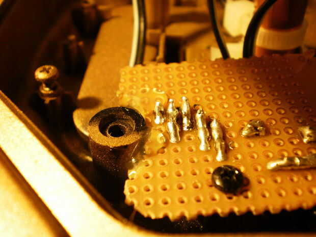Si el tubo de cobre pasa por una tapa superior (como la mía), asegúrese de pasar antes de continuar. Monte el tubo de cobre a la base utilizando cualquier método que usted eligió. La razón de la ranura en el extremo de la tubería de cobre fue para permitir que la tubería que se comprimirá el poste en la base con ataduras de cremallera. Ver la imagen para ver lo que estoy hablando. Decidí aplicar algunas epoxi también para la buena medida. Monte el interruptor en la base y la lleva a la placa de la soldadura. Ahora soldar los cables que salen de la tubería de cobre de los LEDs en el PCB. Asegúrate de que tienes la polaridad correcta! Si tu conector de barril es caso montado, no olvide su conduce a la soldadura. Puesto que todo se suelda ahora, usted puede montar el PCB a la base. Para mí esto incluyó una cantidad ridícula de nuestro querido amigo caliente-pegamento.