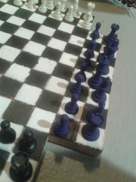 Recientemente, hice un viaje tamaño cerrado el cuadro de juego... seis de ellos realmente. Después de lijar, Esténcil y acabado 60 baldosas pequeñas, quería mi golpe en la cabeza.Siguió con juegos de dos ajedrez... 64 más piezas pequeñas de arena y t