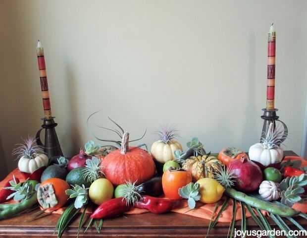 Estos centros de mesa, o tablescapes, también sería bonito sobre una mesa de buffet. Las frutas de la temporada de ponen a buen uso!
