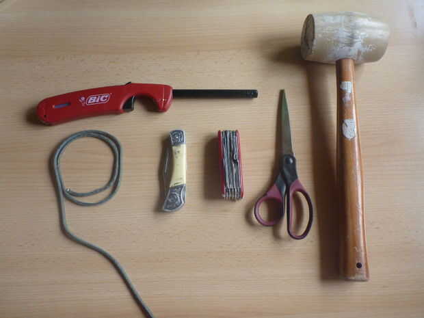 Se necesita la mayoría de los artículos mostrados en esta imagen. También necesita un palo grande y dos palos pequeños que se mostrarán en los pasos después de éste.