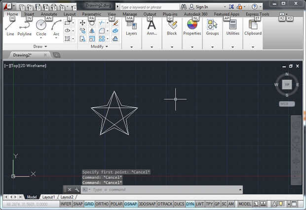Como en el dibujo anterior, dibujar las cinco líneas para cada otro punto en la estrella (aquellos puntos que estaban en el círculo exterior). Otra vez, activar la herramienta de línea al escribir "L" (o de la cinta). Procedimiento alrededor del círculo exterior y conexión de cada otro punto en la estrella, producirá más arriba de la pantalla.