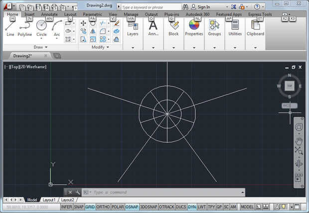 Después de que las líneas son diez líneas (que son también diámetros) se dibujan a través del círculo, crear un segundo círculo dentro del primer círculo. Para ello, escriba "Círculo" o "C", para iniciar el comando. (Se puede también seleccionar en el menú "Inicio" en la cinta.) Coloque el centro del círculo en la intersección de las 10 líneas, utilizando el complemento de "intersección". Hacer el diámetro igual "5" y seleccionar, golpeó bien o entrar para crear el círculo.