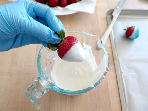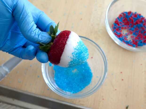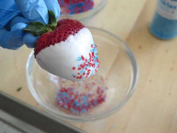 Una vez que se haya derretido la capa, es el momento de sumergir tus fresas! Asegúrese de que todas las gotas de exceso. Cualquier extra sólo le causará problemas al agregar los granas así que lo ahora! Trata de cubrir unos 2/3 de la fresa con la capa. Usted quiere asegurarse de que algunos del rojo todavía muestra, por lo que no cubre toda la cosa!
