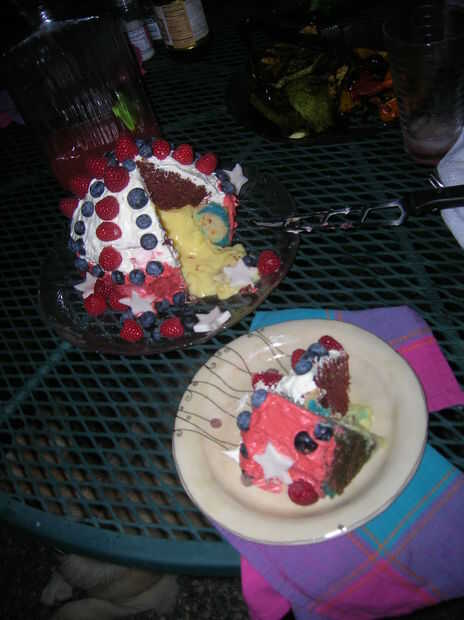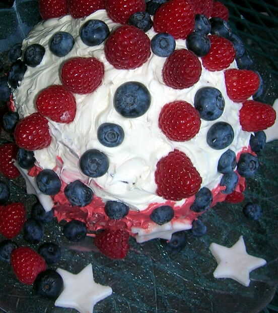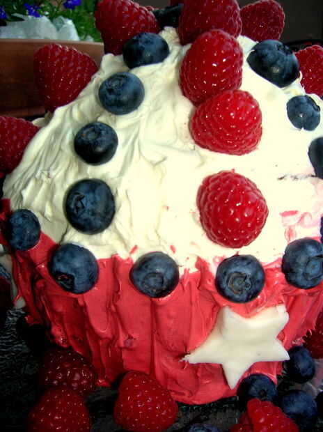 Es un pastel delicioso estilo funfetti, azul y blanco en el base y rojo terciopelo en la parte superior. Hay Pudin de vainilla en el centro. Luego se cubre con una mezcla de queso crema y merengues de crema blanca, frambuesas frescas y arándanos y piezas en forma de estrella de coco joven.