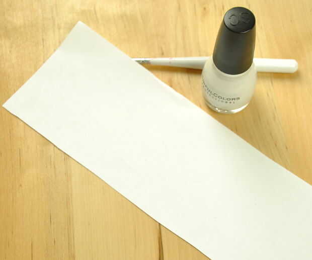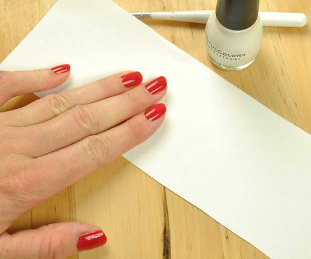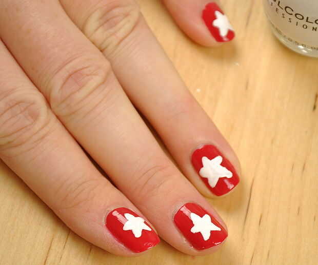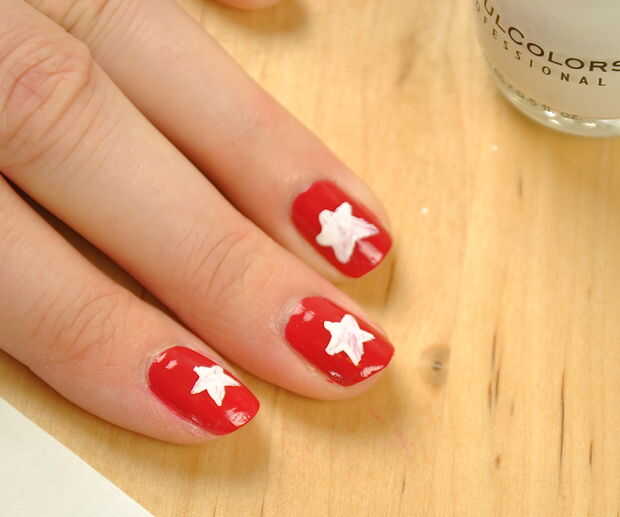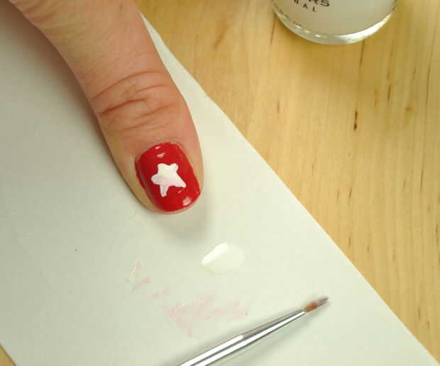 Tu esmalte de uñas blanco y el cepillo de uñas y dibujar en tu estrella.  La primera marcha había manchada de rojo.  Dio ese tiempo para secar y luego en otra capa blanca de la estrella.  Esto cubrió bastante agradable.