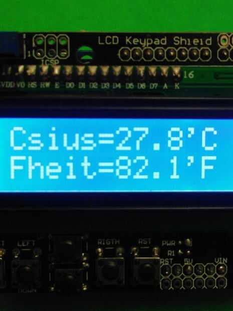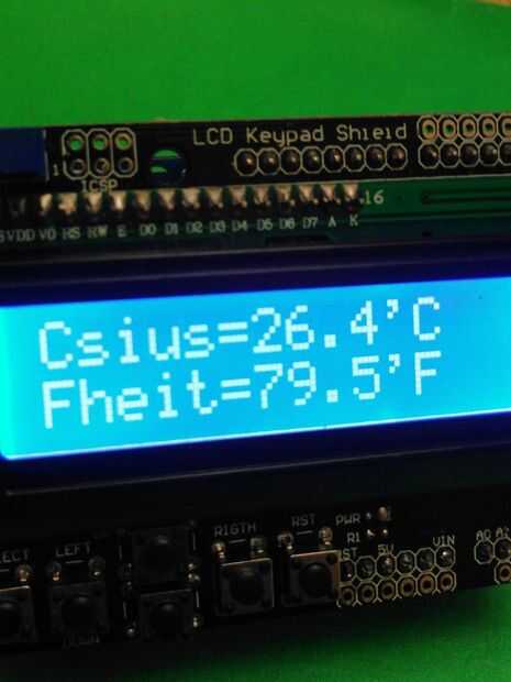 Una vez terminado el escudo de termómetro, apilar en el Arduino Uno y después apilar el escudo de LCD. A continuación, cargar el código en: http://pastebin.com/4fbV3fZr