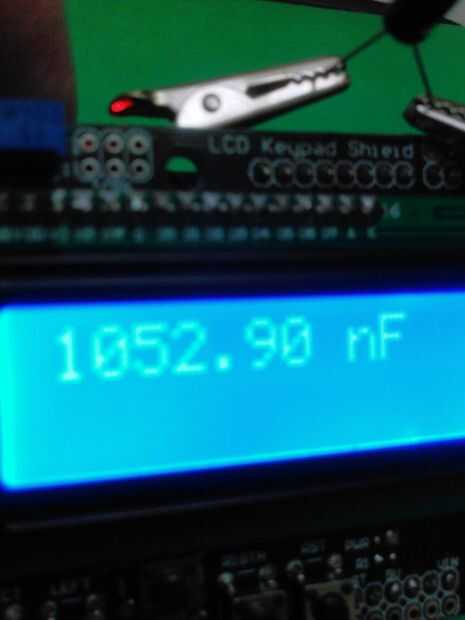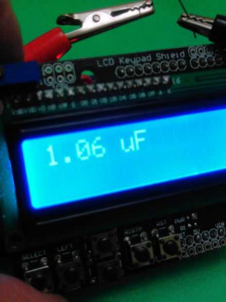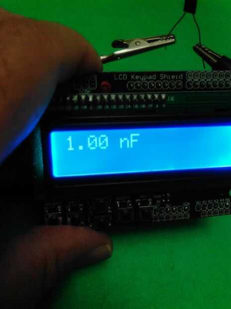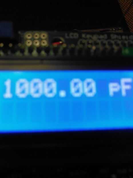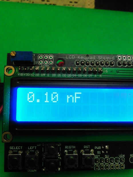 Una vez terminado el escudo de condensador metro, apilar en el Arduino Uno y después apilar el escudo de LCD. A continuación, cargar el código en: http://pastebin.com/VvKrRwVk