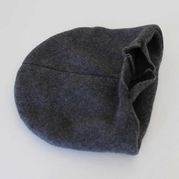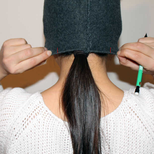 2. colocar sobre uno de los sombreros con la costura en la parte posterior de la cabeza. Asegúrese de que el sombrero cubre las orejas.