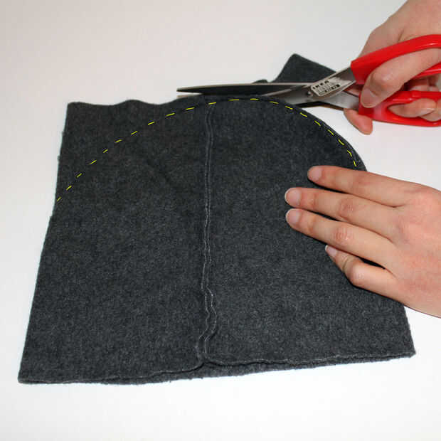 5. quitarse el sombrero y coser a lo largo de la curva que usted marcó (coser por la línea punteada amarilla) y cortar exceso paño grueso y suave.