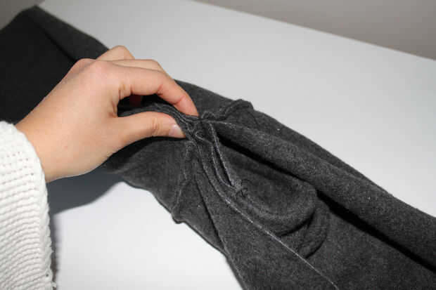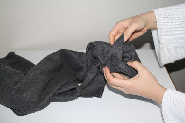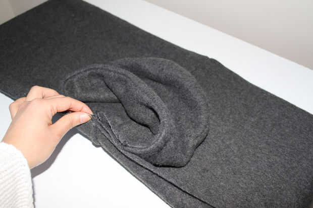 6. ahora tienes una bufanda con un sombrero agrupado para arriba dentro de él. Ahora utilice las aberturas de bolsillo de manopla a la bufanda entera derecha y sacar el sombrero.